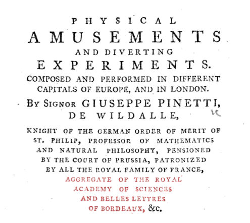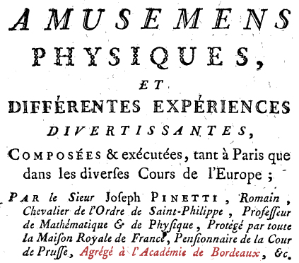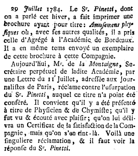 29 July 1784 Mr. Pinetti, who was talked about last winter, published a booklet entitled Amusemens Physiques (“Physical Entertainment”) where, among other titles, he is also attributed as Member of the Bordeaux Academy; he also sent a copy of the book to the same Academy.