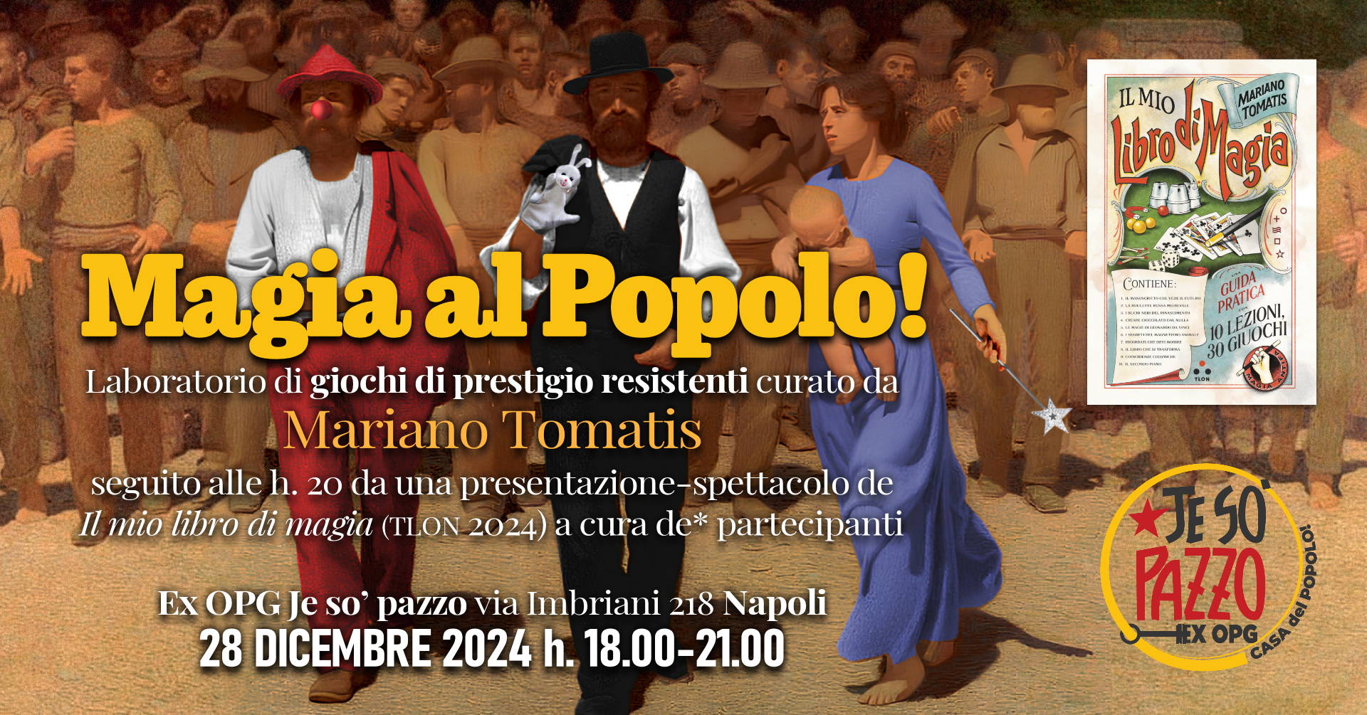 Chi vorrà, al termine del laboratorio potrà immediatamente mettere in scena i trucchi durante la presentazione de Il mio libro di magia (Edizioni Tlon, 2024) che l’autore Mariano Tomatis farà in dialogo con Salvatore Liguori. Oltre ad avere risvolti teatrali e stuporosi, l’incontro sarà un’occasione per riflettere sul potenziale politico di un’arte spesso infantilizzata. Perché, come ha scritto di recente Matteo Glendening in una recensione: