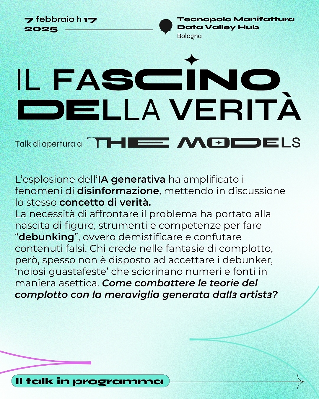 Il 7 febbraio 2025, Bologna ospiterà un evento che esplora i confini sempre più sfumati tra verità, disinformazione e percezione pubblica. “Il fascino della verità”, talk inserito nel programma di Art City Bologna 2025, invita a riflettere su come affrontare il dilagare delle teorie del complotto e della disinformazione, amplificati dall’esplosione dell’intelligenza artificiale generativa. L’evento si terrà al Tecnopolo Manifattura Data Valley Hub, un simbolo di innovazione tecnologica e culturale.