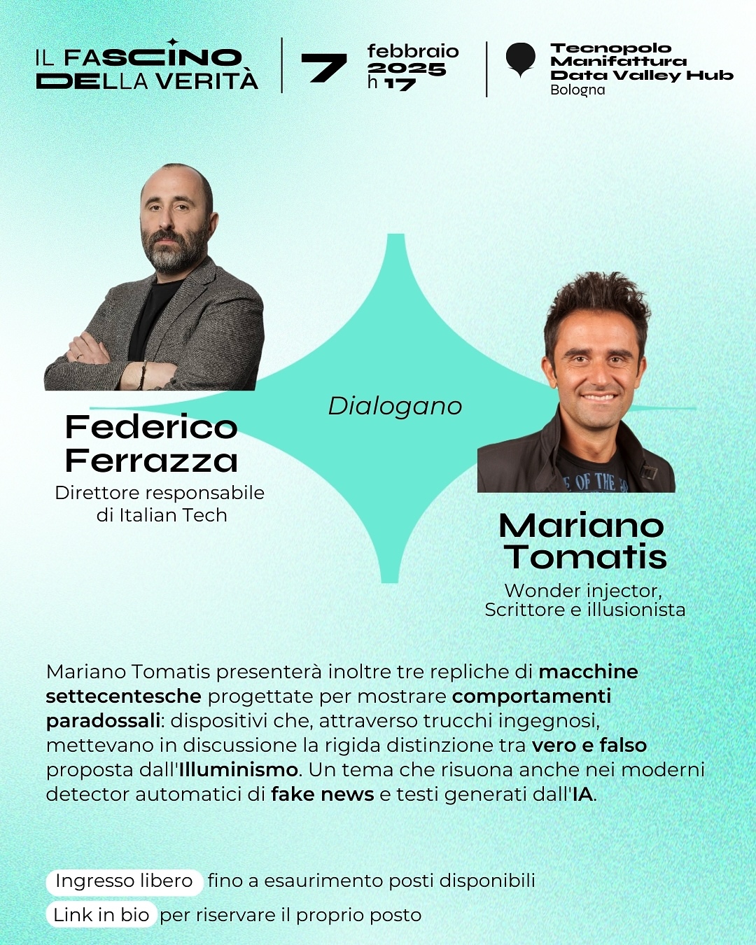 Mariano Tomatis: illusionista, scrittore e storico, porterà una dimensione affascinante e inusuale al dibattito. Da anni si occupa di esplorare il legame tra illusionismo, parapsicologia e i meccanismi della meraviglia, analizzandone i risvolti politici e filosofici. Durante il talk, Tomatis presenterà tre repliche di macchine settecentesche progettate per produrre effetti paradossali e sconcertanti. Questi dispositivi, attraverso trucchi ingegnosi, sfidavano le certezze dell’Illuminismo, mettendo in discussione la rigida distinzione tra vero e falso – una provocazione che trova un’eco contemporanea nei moderni detector di fake news e nei modelli di IA generativa.