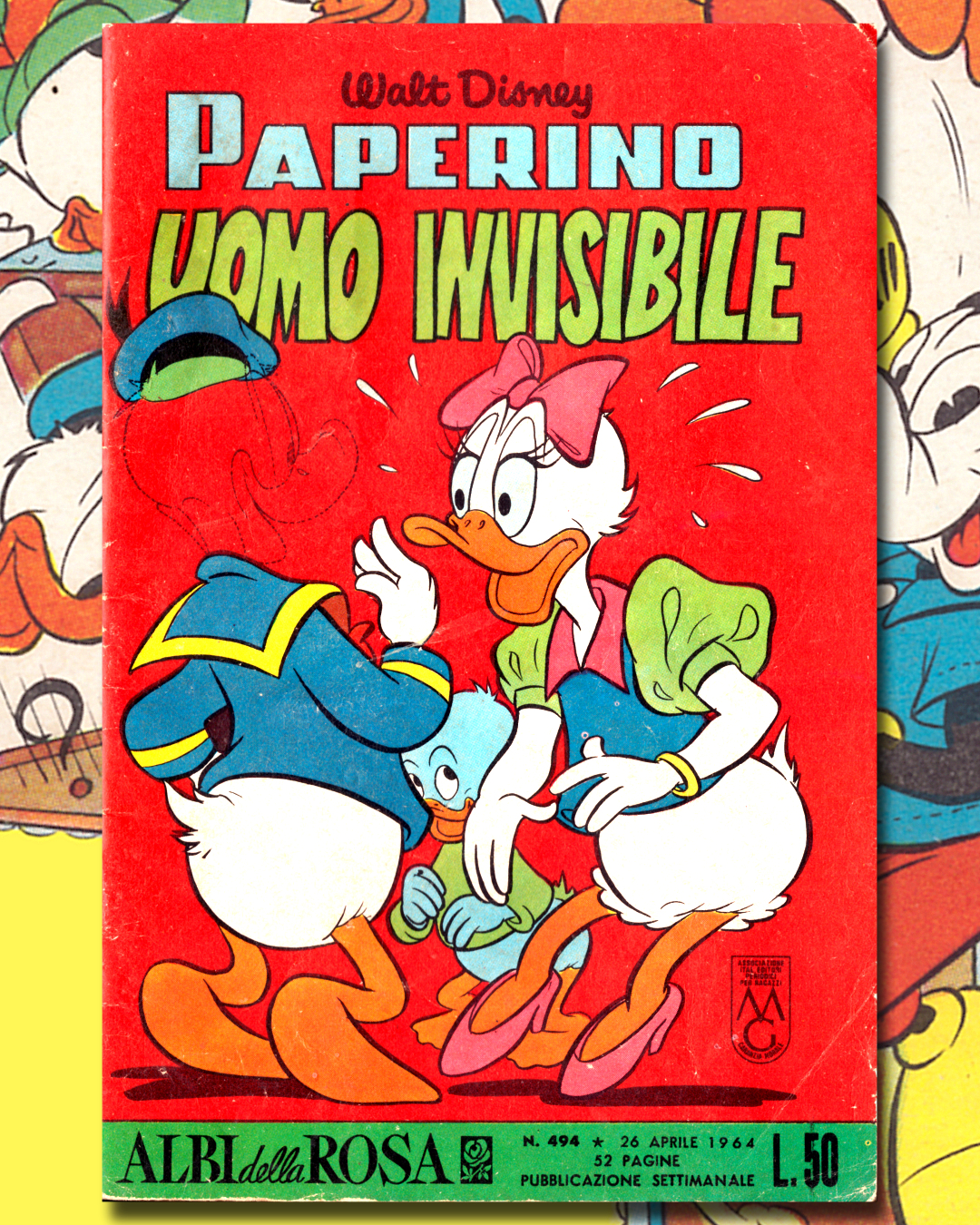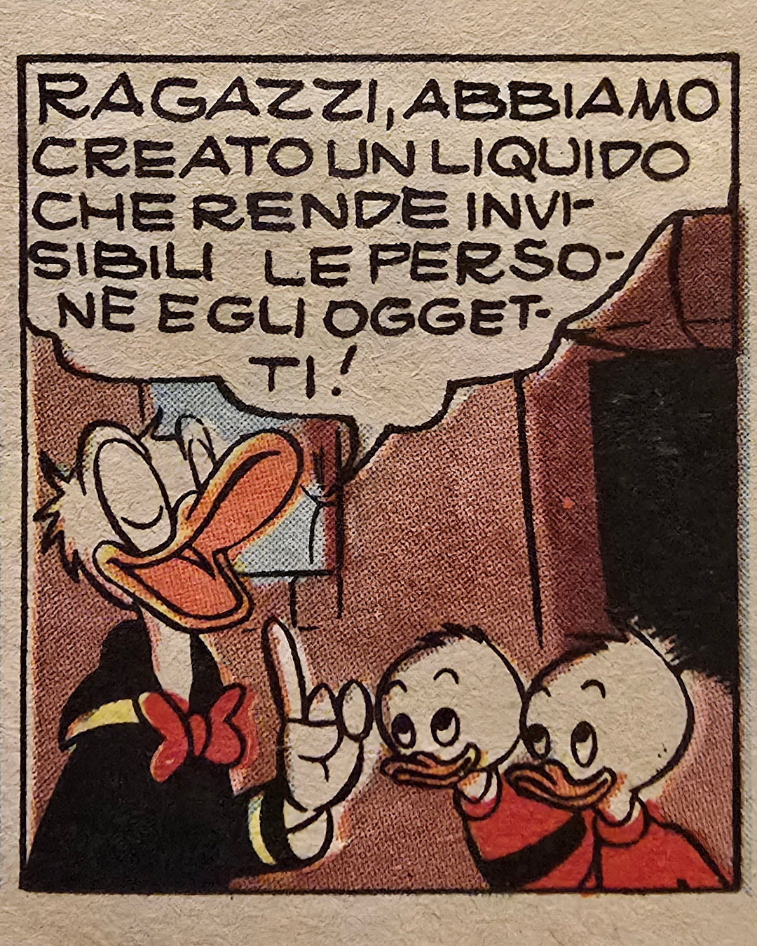 In “Paperino uomo invisibile” (Albi della Rosa, n. 494, 26 aprile 1964), un esperimento domestico trasforma un semplice insetticida in una formula per sparire dalla vista: invece di uccidere le formiche, le rende invisibili. Spruzzata su una mano, la sostanza la fa scomparire – e per Paperino si apre un mondo di possibilità.
