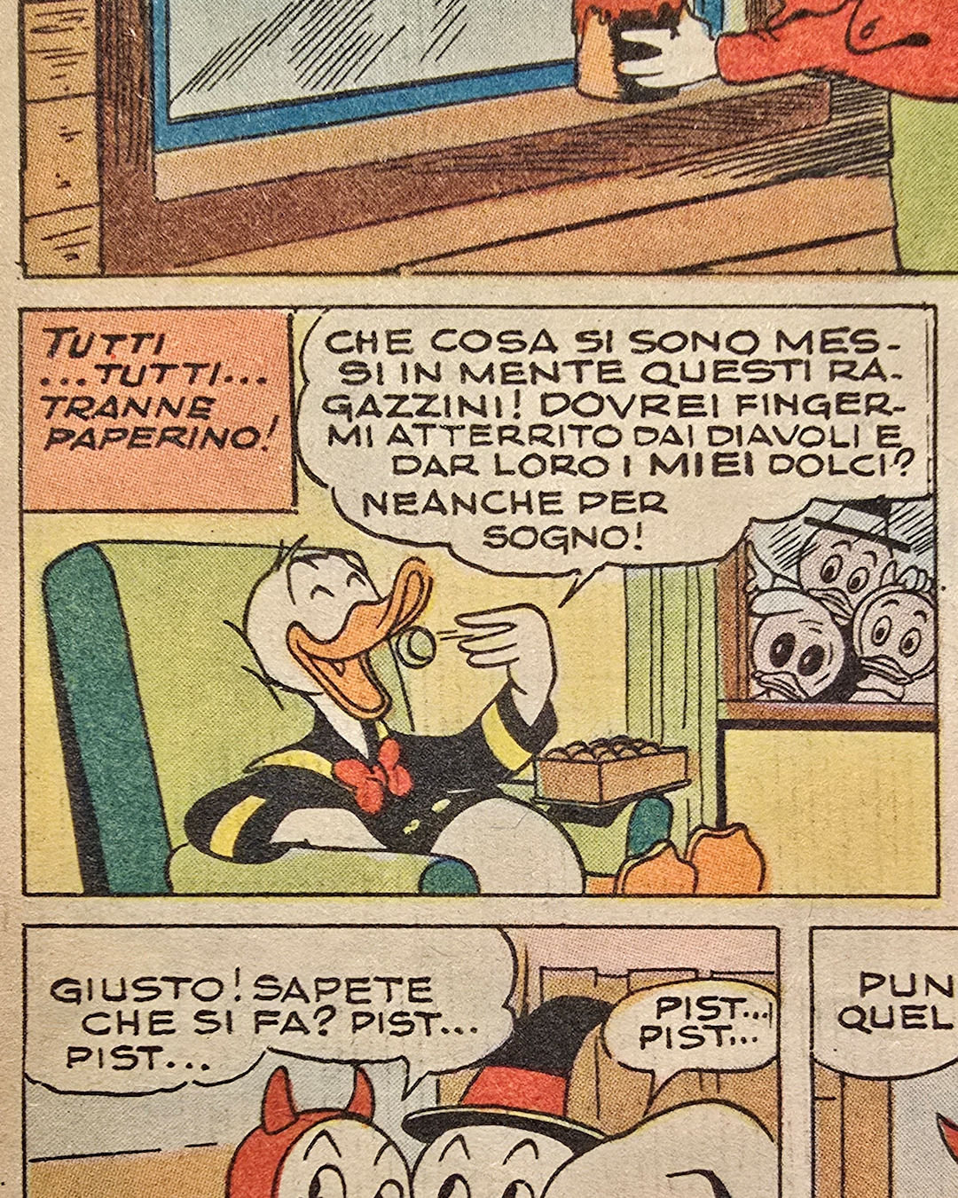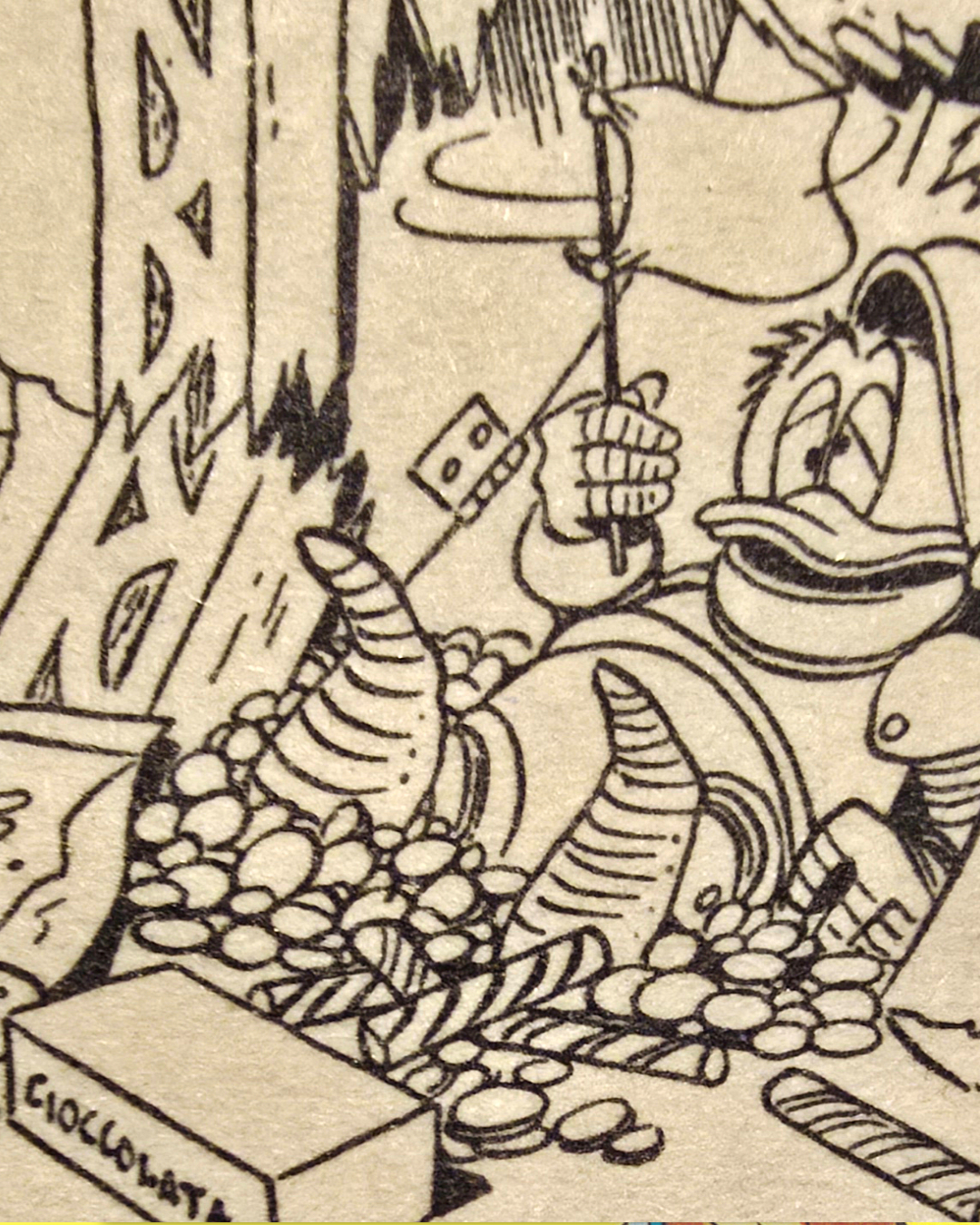 Nel racconto Disney, neppure quella alleanza avrà la meglio: ci vuole uno schianto. Catapultato contro la credenza, Paperino la sfascia e dai suoi ripiani piovono caramelle.