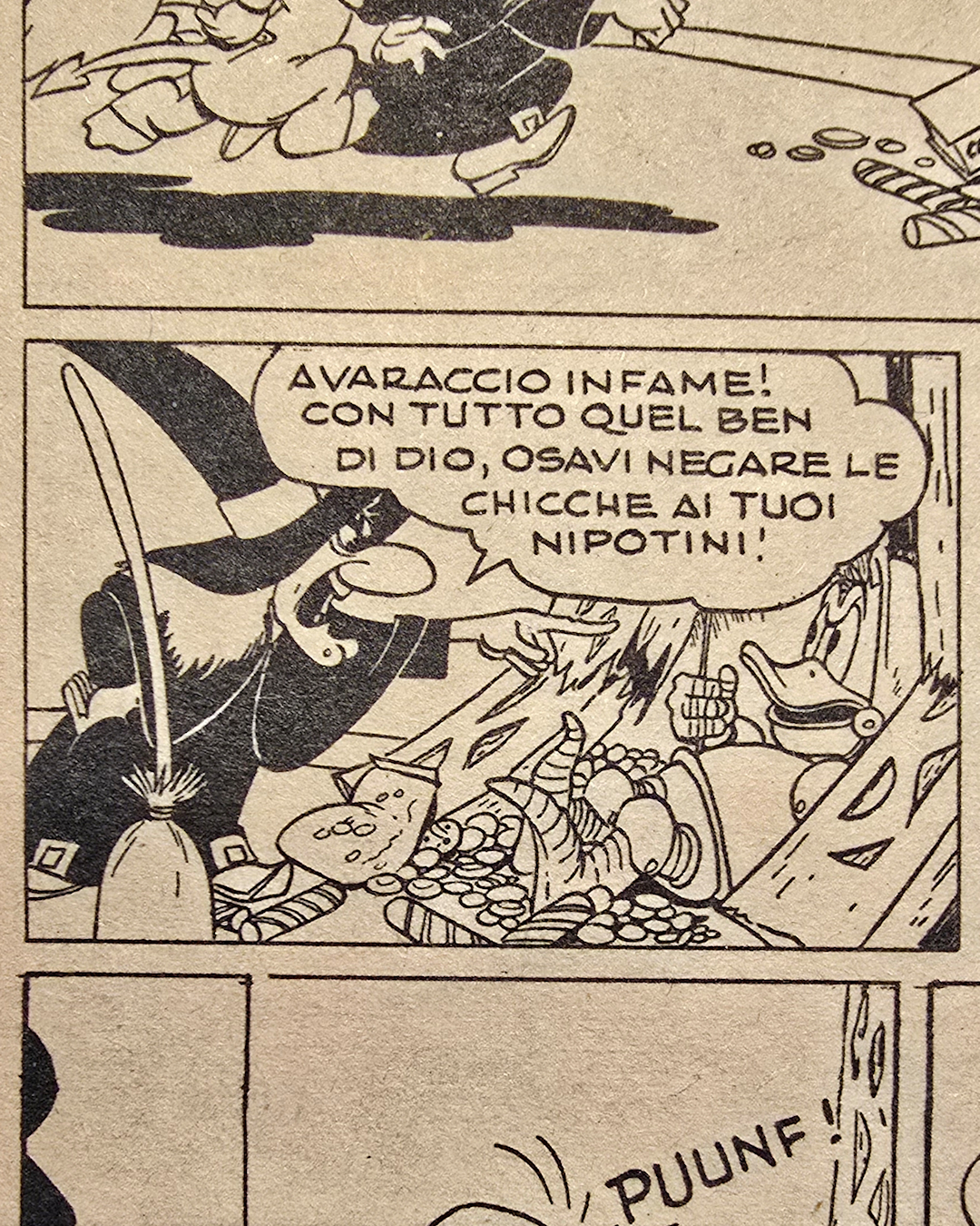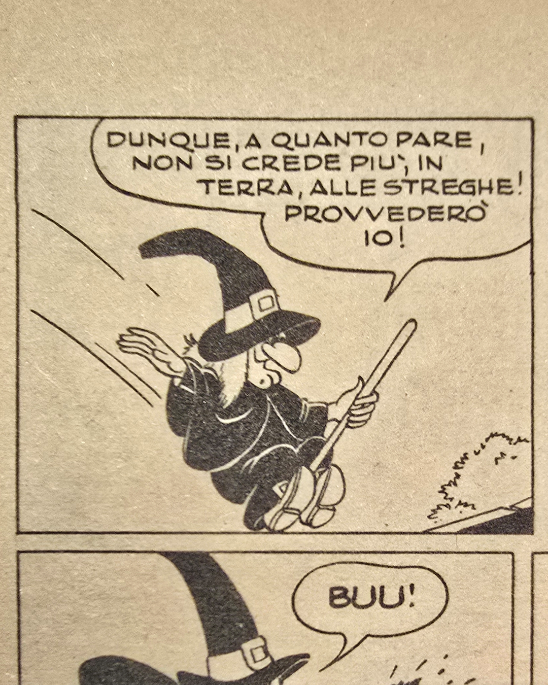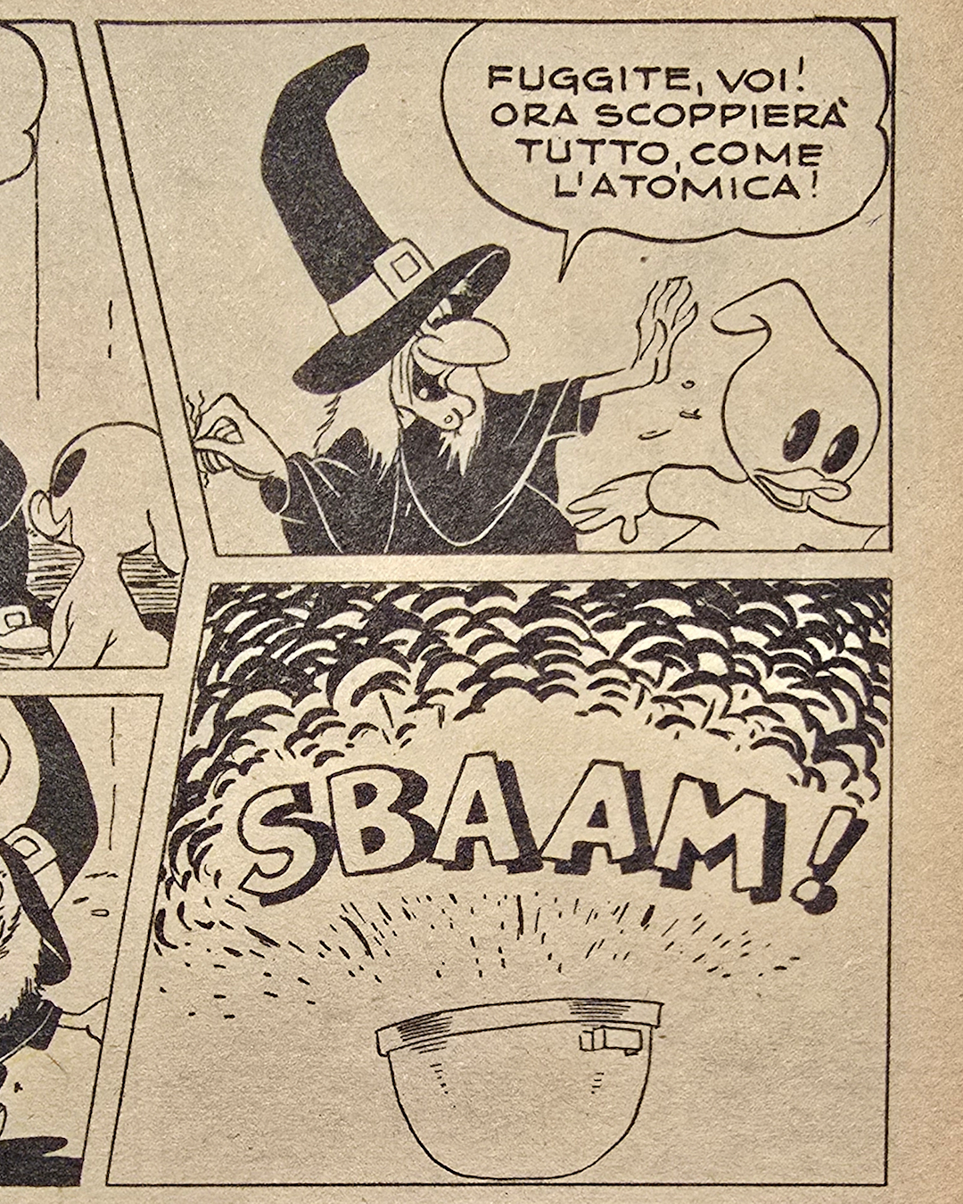 I tre si rivolgono alla strega Nocciola, che lancia un incantesimo “potente come l’atomica” (13 anni dopo Hiroshima) ma nemmeno quell’attacco magico scuote Paperino, che incassa tutto con la spavalderia di chi si crede intoccabile.