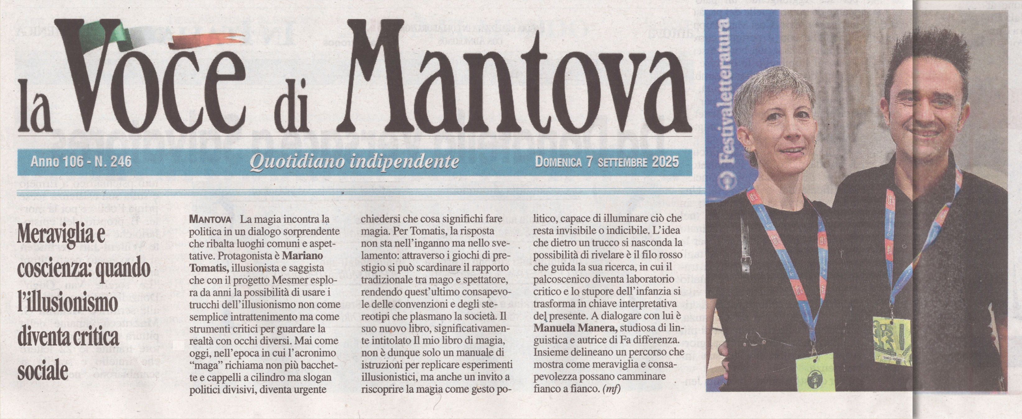 “Meraviglia e coscienza: quando l’illusionismo diventa critica sociale” in La Voce di Mantova, 7.9.2025, pp. 16-7.
