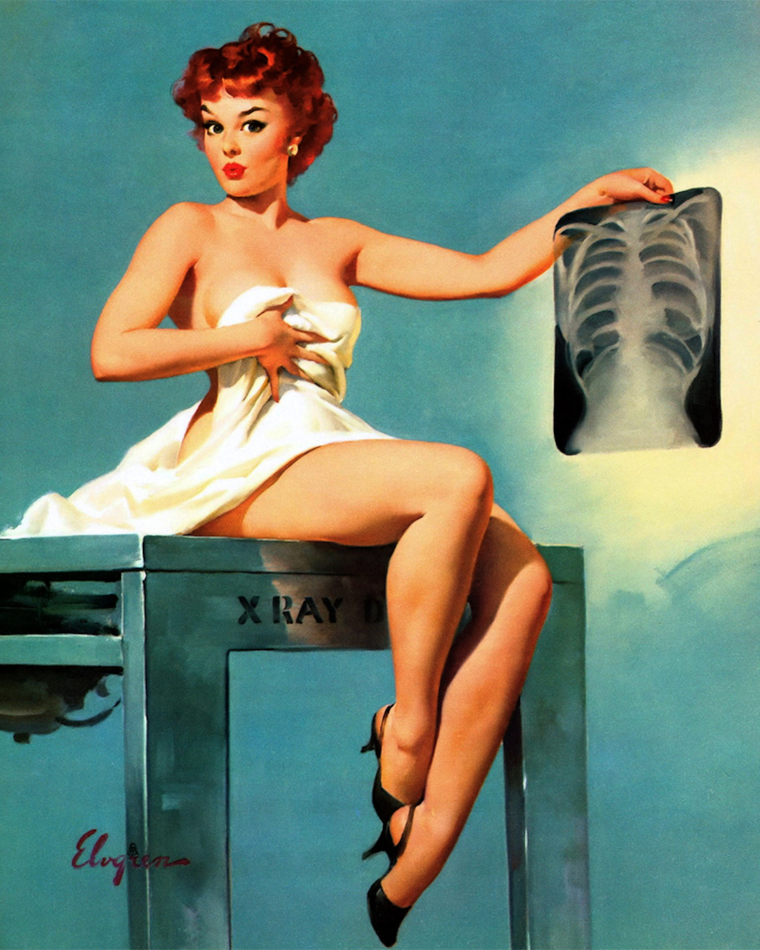 Nel 1959 Gil Elvgren dipinge “Inside story”: una giovane mostra stupita la radiografia del proprio torace.