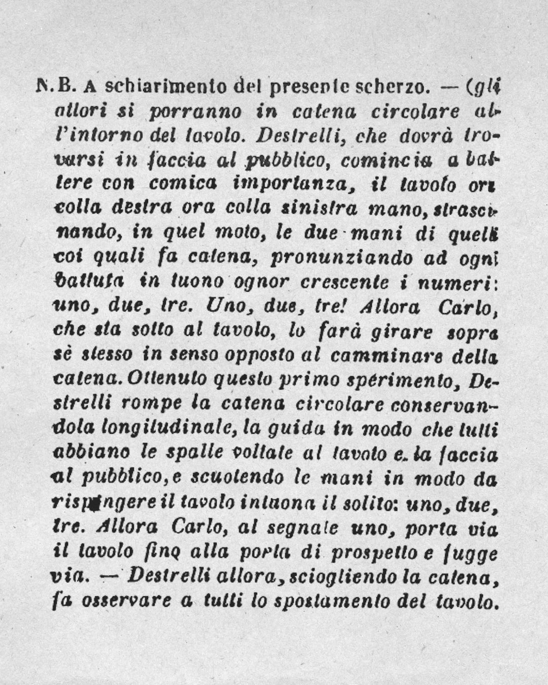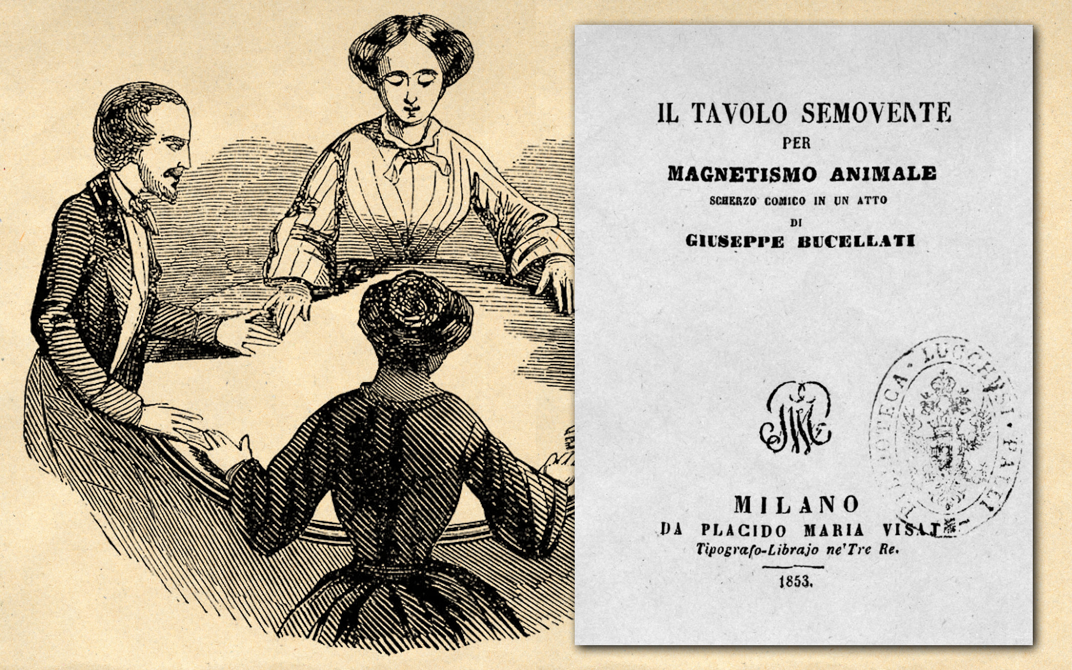 Nel 1853 in Europa appaiono le prime tavole danzanti; con tempismo eccezionale, Giuseppe Bucellati nello stesso anno porta a teatro lo scherzo comico “Il tavolo semovente per magnetismo animale”.