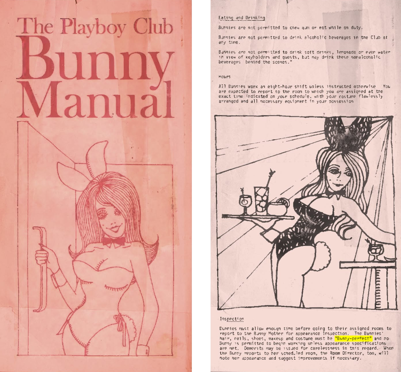 Nel 1968 le conigliette dei Playboy Club avevano a disposizione un Manuale operativo (scarica) che regolava con minuziosa precisione ogni aspetto del loro lavoro: turni, doveri, galateo... ma soprattutto l’estetica. Prima di entrare in servizio, ciascuna doveva presentarsi alla Madre Coniglietta per l’ispezione: capelli, unghie, scarpe, trucco e costume dovevano risultare “bunny perfect”. Ogni difformità comportava penalità.