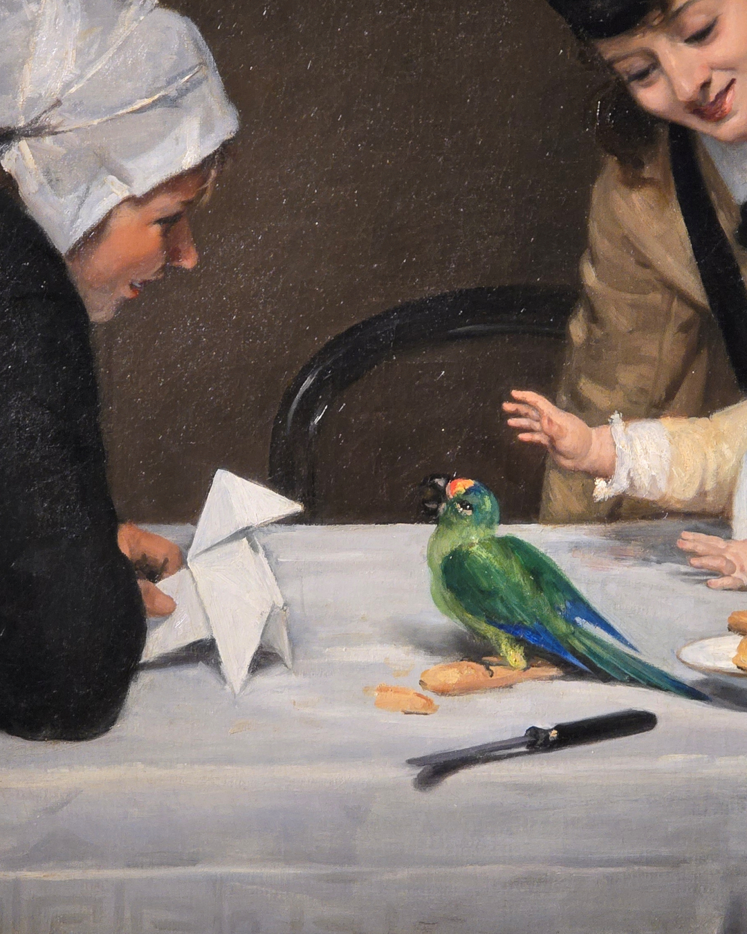 Due elementi magici si disvelano analizzando più a fondo l’opera. A livello superficiale, la scena è apertamente illusionistica: la realtà del pappagallo si specchia nella sua simulazione e agli occhi della bambina, l’illusione riesce alla perfezione. Da dove emerga lo stupore, lei non ce lo può dire: forse dal vedere animarsi un foglio di carta, grossolanamente piegato a ricordare un piccolo pennuto?