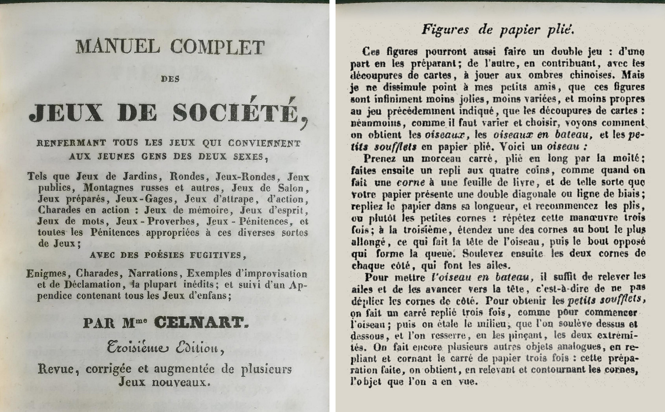 La storia tecnica dell’oggetto dischiude un risvolto magico più profondo: l’origami è una “cocotte” (gallinella), il primo modello di cui ci sia traccia nella letteratura per l’infanzia in Occidente. A descriverlo fu Élisabeth Celnart, la prolifica autrice del “Manuale completo dei giochi di società” (1827).