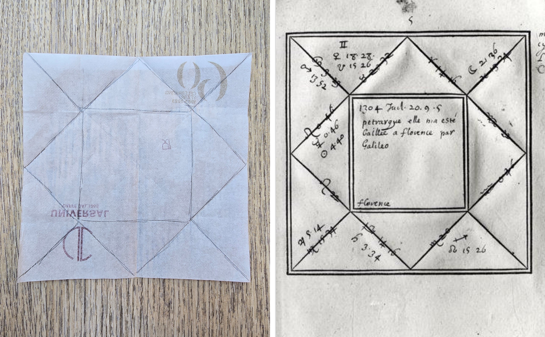 Prima che il tema natale diventasse circolare, nel Medioevo si tracciava il destino dentro un reticolo quadrato, composto da tre cornici concentriche. Per ottenere quella geometria da un foglio servivano le stesse pieghe fondamentali della “cocotte”. È dunque plausibile che l’origami francese sia l’evoluzione ludica di una struttura astrologica originaria dei paesi arabi.