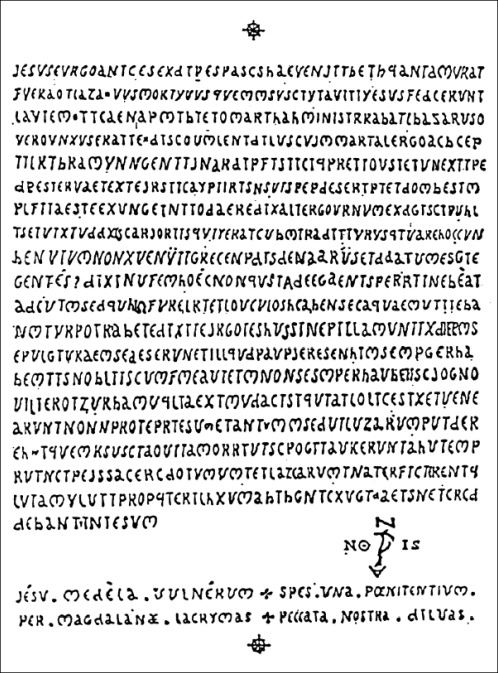 The author looked for a Latin text from the Gospel in which to hide the 140 letters and he chose a chapter from the Gospel of John (12:1-11) with a number of connections with the church in Rennes-le-Château, involving Lazarus, Martha and Mary, the three brothers from Bethania. In particular, the text told the story of the woman anointing Jesus' feet. Some traditions identify Mary of Magdala and Mary of Bethania, the main character of this text, and in Rennes-le-Château there are so many references to Magdala and Bethania. Moreover, the church hosts a stained glass showing Lazarus' resurrection and another one with a woman anointing Jesus' feet.
