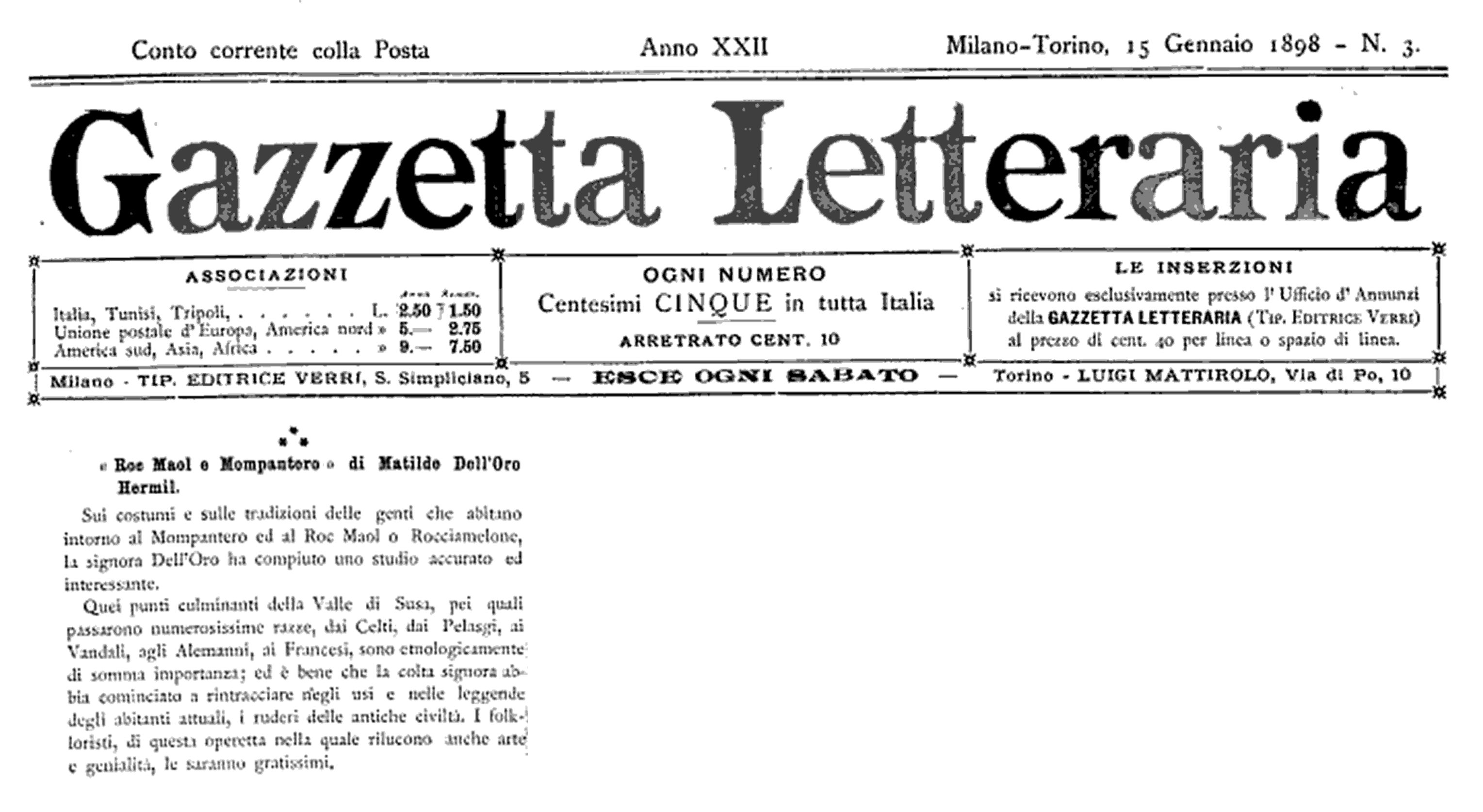 Sono qui raccolti in forma digitale alcuni articoli e racconti pubblicati da Matilde Dell’Oro Hermil tra il 1887 e il 1898. Seguono tre recensioni del suo libro Roc Maol e Mompantero (1893 e 1897).