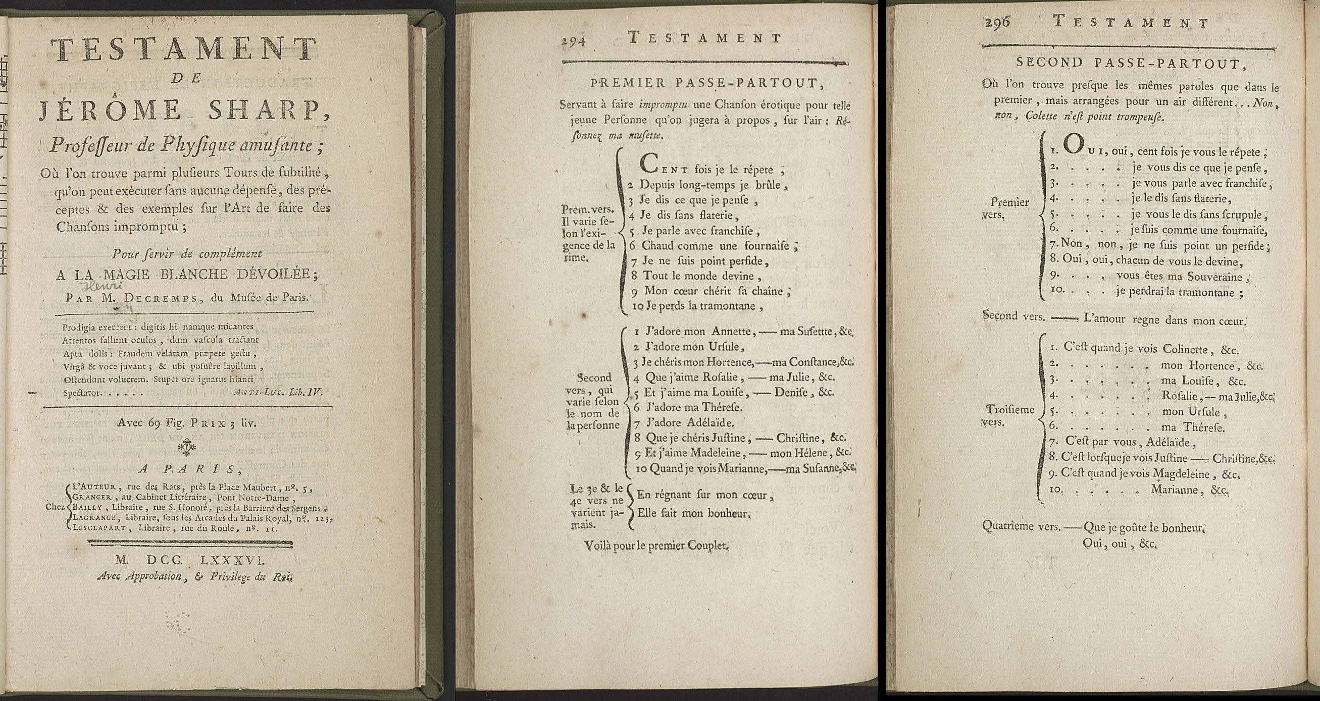 Alcuni passe-partout proposti da Henri Decremps nel suo manuale di trucchi “che si possono eseguire senza spesa alcuna”, tra cui quelli relativi all’arte “di comporre canzoni impromptu”.