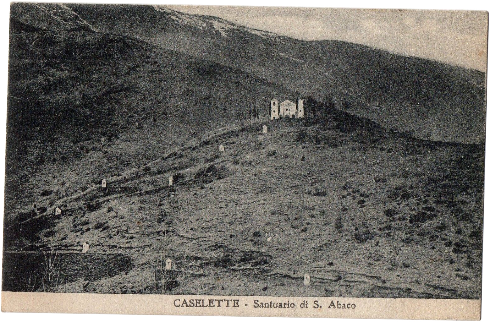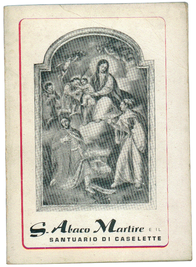La montagna di Caselette, detta nelle antiche carte Mons Asinarius o Monte Asinaro, Musinaro o Musinè, è quella prima sommità che a poca distanza da Torino, alzandosi dalla pianura della Dora Riparia, viene a formare il primo gradino di quell’alta giogaja, che sulla sponda sinistra della Dora mano a mano si eleva, e va sopra Susa a terminare alle roccie gigantesche che dominano il passaggio del Monte Cenisio. Su questa montagna esiste a mezzo colle una antichissima cappella, che dal più giovane dei nostri Santi Martiri di Sant’Abaco si appella. […] La fondazione di questa Cappella è molto antica. Le memorie che si sono potute rinvenire ne parlano sempre come di fondazione immemorabile. […] Avvi una tradizione popolare, che fa salire questa fondazione al finire del secolo X; quando cioè San Giovanni di Ravenna lasciava quella sua sede Arcivescovile e veniva a ritirarsi nella valle di Susa. […] Spinto dal desiderio di vedere in particolar modo venerato l’Arcangelo San Michele, […] ebbe a conoscere essere volontà di Dio che la chiesa a San Michele dovesse erigersi non sul dorso del monte Caprasio, ma sibbene sulla cima del monte Pirchiriano che gli sta di fronte dall’altro lato della Dora. […] Fu ivi innalzata la superba mole detta Sacra di San Michele. Dice adunque la tradizione che un compagno di San Giovanni non l’abbia seguito al monte Pirchiriano, ma […] si ritirò più verso le pianura del Piemonte sino al monte Asinaro, ove trovò un sito adattato per fabbricare una Cappella dedicata ai santi martiri Mario, Marta, Audiface ed Abaco. Egli si portò ivi ad abitare, mosso dal desiderio di vita solitaria e da speciale divozione, che sentivasi pei nostri santi. […] Pare che vi si possedesse solamente qualche reliquia di Sant’Abaco, come vi è ancora attualmente, che perciò fu chiamata la Cappella di Sant’Abaco, sebbene vi si venerino egualmente ed i suoi Genitori, ed il suo Fratello martiri. (1)