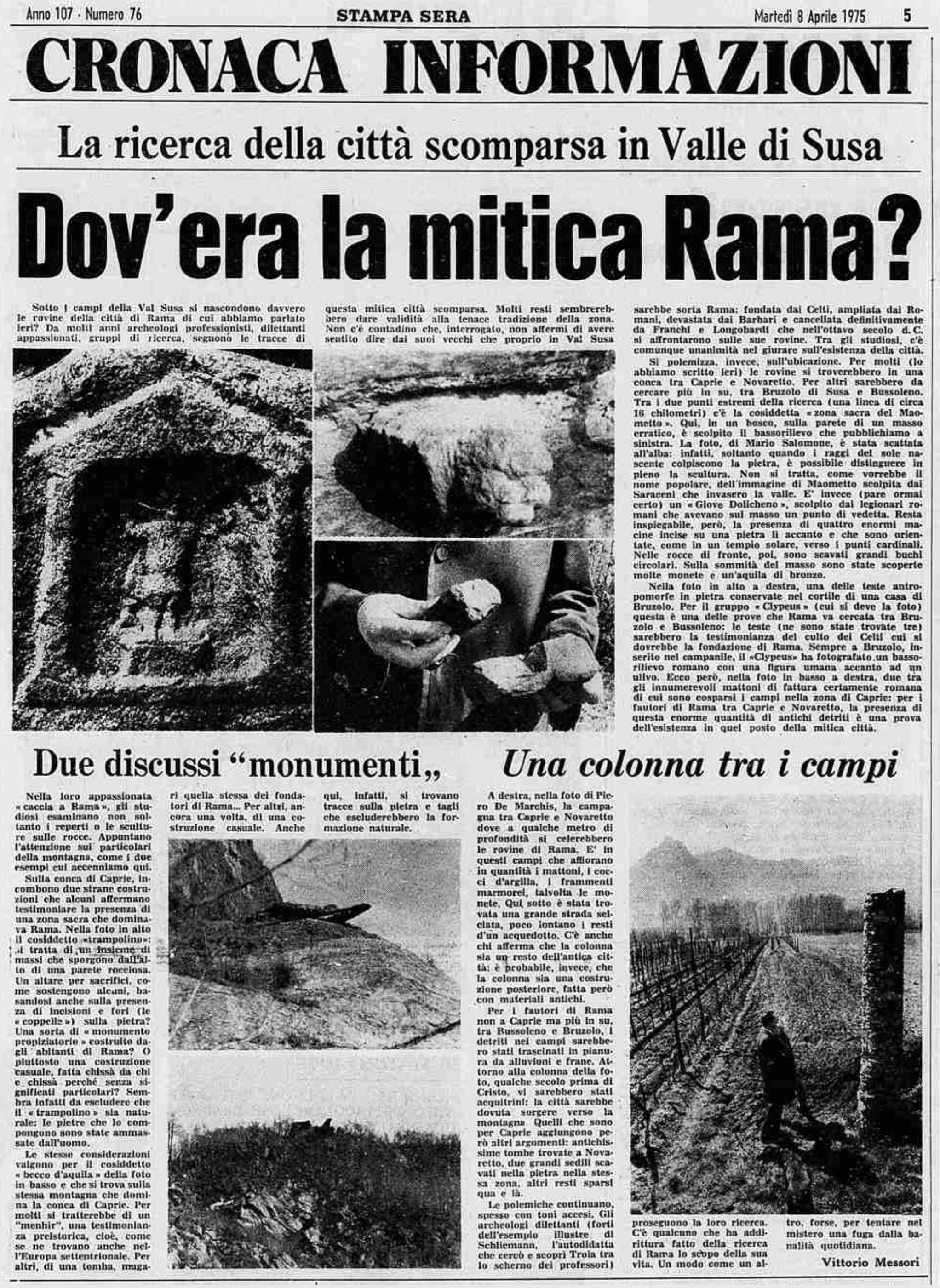 Sede di enormi ricchezze, il luogo avrebbe attirato legioni di invasori. Ori e preziosi della città sacra erano custoditi sulla sommità della montagna e protetti da misteriosi meccanismi; le cronache dell’abbazia di Novalesa riportano numerosi e vani tentativi di conquistarlo: chiunque provasse ad avvicinarsi “n’era respinto da improvvisa folta nebbia con grandine di pietre e pioggia di saette e accompagnamento di spaventevole fragore”. Culmine del libro è un epico scacchiere astrologico, allestito da Hermil per illustrare Rama nel momento di massima potenza. La città sacra era “la sede pacifica intellettuale” dell’Ariete, minacciata a Est dalla città del Toro – quella Torino “rappresentante la forza bruta” che cospirava “tra le nebbie del Po”. Se a Ovest poteva contare sulla protezione del “passo fortificato” di Susa, a Nord era il Bosco Nero (ideale “anticamera del trono”) “a parare e a ripostare i colpi dell’invasore”. Con la sua possenza il Roc Maol era “il deposito, la cassa forte del tesoro, la vedetta” dotata di “macchine infernali per tenere lontano gli importuni”. Tutto finì quando, come Atlantide, la città di Rama si inabissò misteriosamente “sotto il terreno di alluvione tra i torrenti di Foresto, di Chianoc e di Bruzolo”; da quel giorno risultò “scomparsa fin dall’elenco dei morti”.