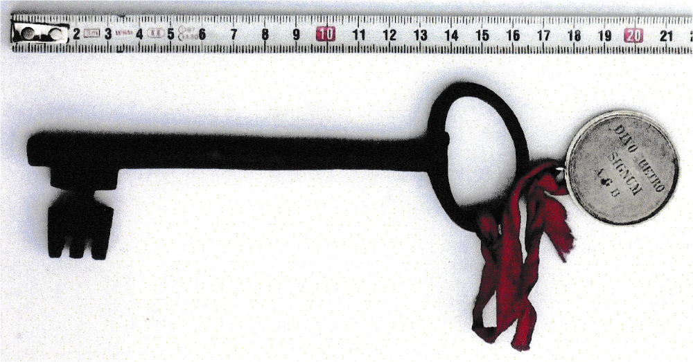 Come testimonia Gino Gallo in Storie rivaltesi (2015), il 9 maggio 2014 don Stefano Revello ritrova la chiave: è in ferro, lunga 17 cm e porta una medaglia legata da un nastrino rosso; su una faccia della medaglia si trova incisa una chiave, mentre dall’altra si legge la scritta “Divo Petro Signum A. G. B.”. La sigla potrebbe significare “Ad Gesta Bellarum”, contro i morsi delle bestie.