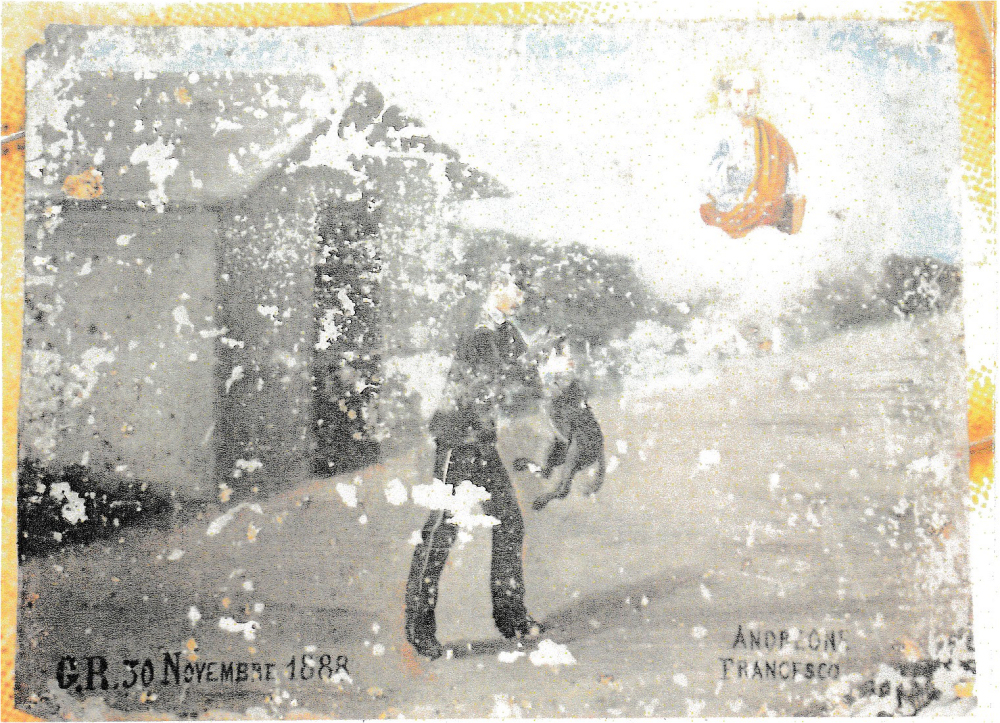 Giuseppe Ricci individua due ex voto ottocenteschi. Il primo testimonia un incidente occorso a tale Francesco Andreone, morsicato da un cane alla mano il 30 novembre 1888. In alto a destra c’è San Pietro con la chiave in mano.
