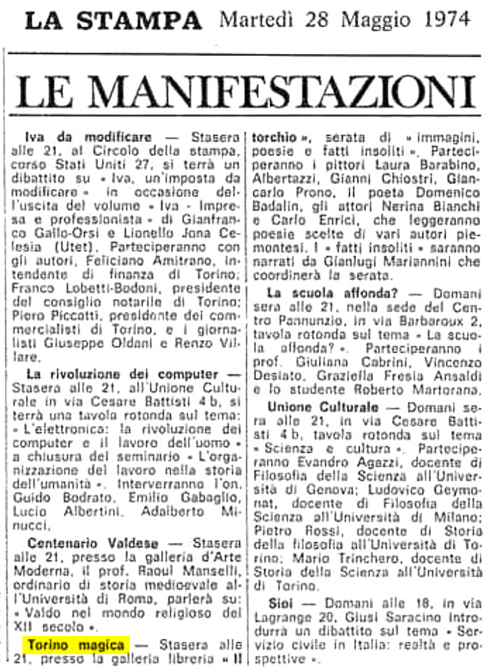 Il 28 maggio 1974 Gianluigi Mariannini conia l’espressione “Torino magica” per una serata di “immagini, poesie e fatti insoliti” da lui coordinata.