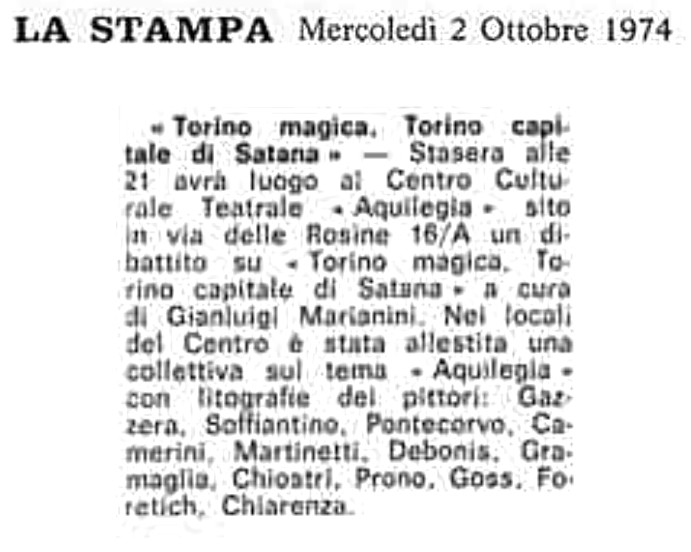 Mariannini torna sul tema esplicitando l’ingrediente demoniaco nel successivo dibattito proposto il 2 ottobre 1974 dal titolo “Torino magica, Torino capitale di Satana”.