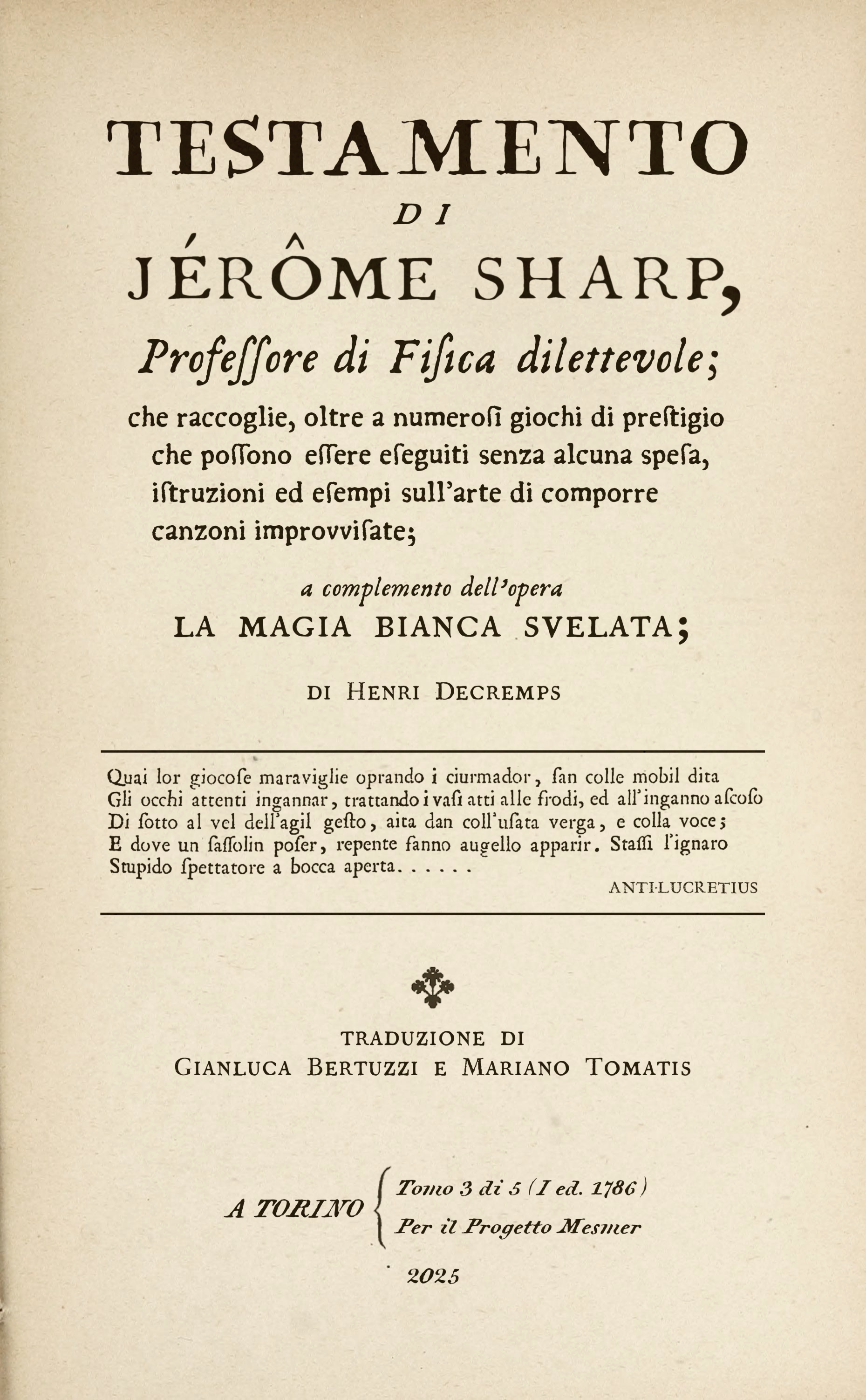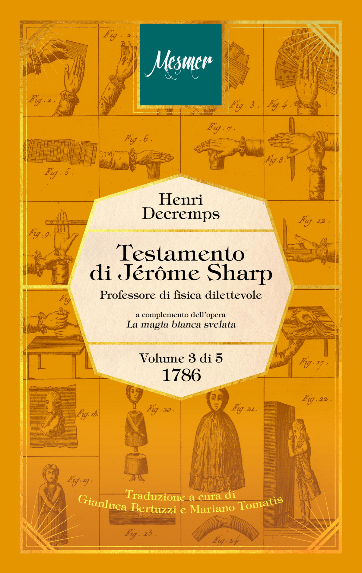 Secondo supplemento al manuale di illusionismo di Henri Decremps La magia bianca svelata (1784), questo volume amplia e completa i due precedenti (Volume 1 | Volume 2), offrendo una ricca raccolta di giochi di prestigio, tecniche di mentalismo e sorprendenti effetti illusionistici. Presentato come il testamento di un immaginario maestro illusionista del Settecento, Jérôme Sharp, il libro si apre con l’enunciazione dei tredici principi fondamentali dell’illusionismo, un repertorio teorico che avrebbe influenzato generazioni di maghi e studiosi. La prima parte esplora in dettaglio i trucchi di una finta sensitiva parigina, rivelando avanzate tecniche di cold reading e strategie psicologiche utilizzate per simulare fenomeni paranormali, oltre a descrivere una serie di ingegnosi giochi di prestigio con le corde. La seconda parte è interamente dedicata alla cartomagia e rappresenta uno dei trattati più completi del XVIII secolo su questo argomento: vi si trovano descrizioni di tecniche di destrezza, falsi miscugli e sottigliezze psicologiche, così accurate da essere state recentemente analizzate in dettaglio da Roberto Giobbi (qui). La terza parte è più leggera e divertente, con una varietà di trucchi da salotto e scherzi ingegnosi, tra cui metodi per imitare il canto degli uccelli, improvvisare canzoni in rima e simulare una memoria prodigiosa, con l’aggiunta di un book test e alcune tecniche mnemoniche genuine. Quest’opera non è solo un manuale tecnico, ma un documento storico che racchiude intuizioni fondamentali sull’arte della prestidigitazione e della manipolazione mentale. Si ritiene che questo libro possa essere stato la fonte primaria di ispirazione per Gustavo Rol, che lo avrebbe scoperto a Marsiglia durante il suo soggiorno in Francia; infatti, molte dimostrazioni descritte da Decremps coincidono con i fenomeni per cui Rol divenne celebre, come l’imprevedibilità dei poteri (p. 36), l’uso delle circostanze per creare prodigi sorprendenti (p. 50), l’esecuzione di giochi senza mai toccare le carte (p. 98), la trasformazione di una carta in un’altra (p. 108), il coinvolgimento inconsapevole di complici tra il pubblico (p. 111), il trucco del martello che non cade (p. 125) e l’abilità di guidare la conversazione su un tema preparato per eseguire un effetto (p. 182). Con uno stile vivace e ironico, Decremps non solo svela i segreti dei prestigiatori, ma fornisce un’opera unica che intreccia arte, scienza e filosofia, destinata a rimanere un caposaldo nella storia dell’illusionismo e del mentalismo.