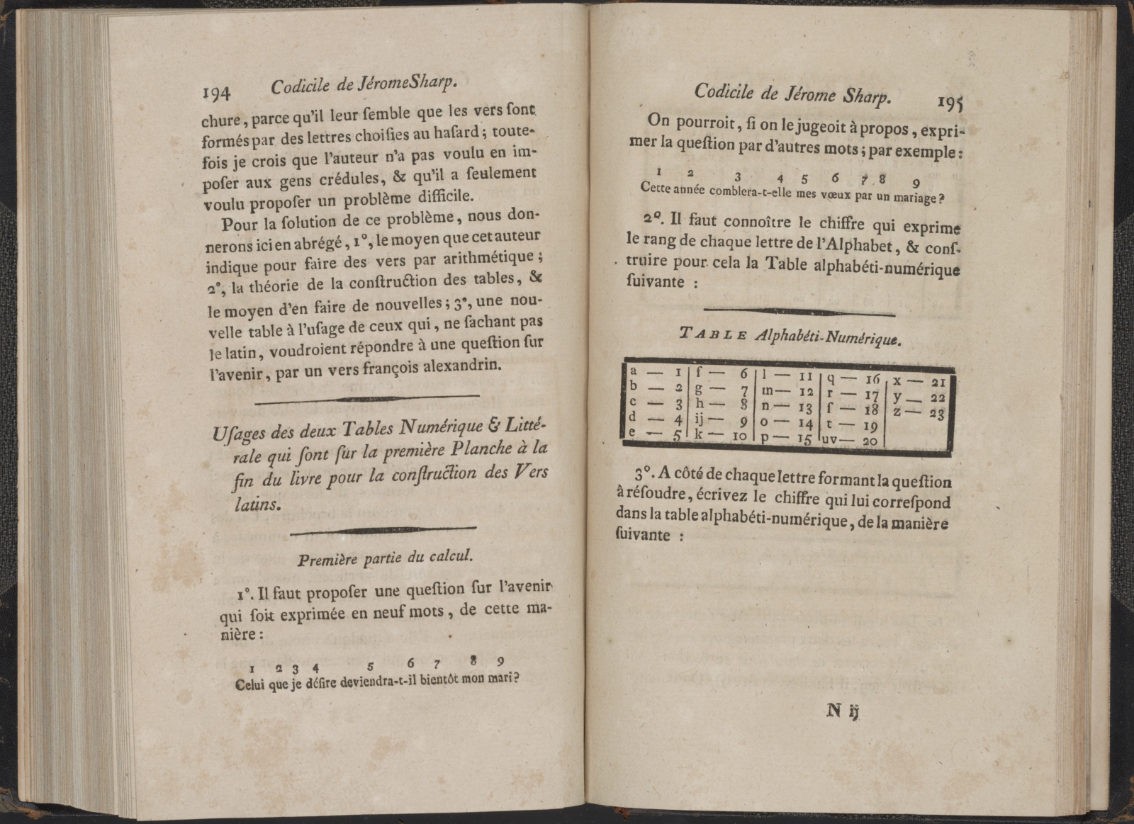 Il primo ad accorgersi del suo potenziale magico è stato Henri Decremps, che ha riproposto l’oracolo nel quarto volume della sua serie dedicata alla prestigiazione: il Codicile de Jerome Sharp (4) (1788) presenta in coda la coppia di tavole in una planche fuori testo.