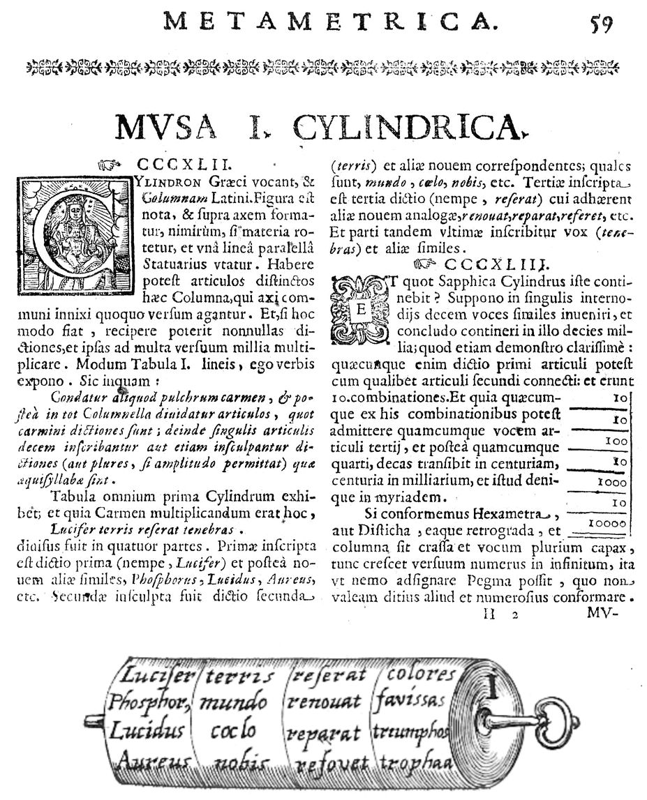 Nel 1663 Juan de Caramuel aveva progettato un cilindro composto da quattro settori rotanti; ciascun settore presentava dieci parole, e ruotandoli casualmente si potevano produrre fino a diecimila frasi di senso compiuto. (2)