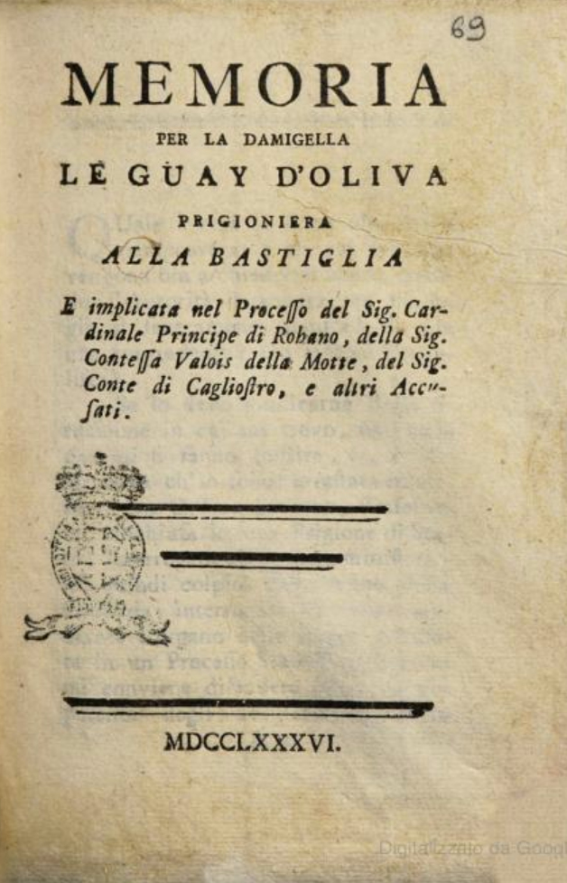 Memoria per la damigella Le Guay d’Oliva prigioniera alla Bastiglia e implicata nel processo della Collana della Regina