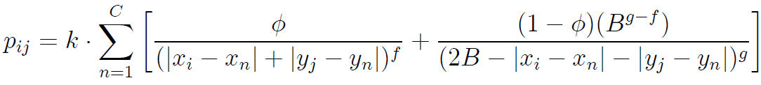 La formula di Kim Rossmo funziona perfettamente con i dati che le ho fornito: il mio abituale posto di lavoro cade perfettamente al centro della zona calda, rappresentata in giallo al centro della mappa!