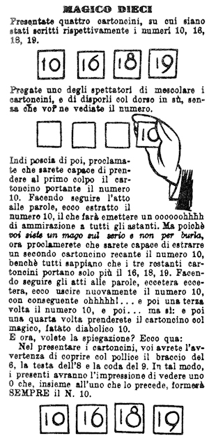 Volete far rimanere a bocca aperta la mamma, il babbo, gli zii e magari anche la scaltra portinaia? Eccovi qua TRE giochi di prestidigitazione facili a imparare, facili a eseguire, ma DIFFICILISSIMI a essere risolti dagli incompetenti. Cominciamo con il "Magico dieci":