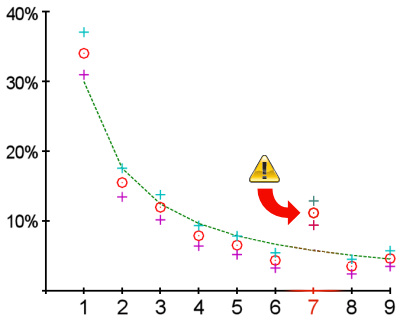 Boudewijn F. Roukema utilizza proprio questo metodo(1): città per città, analizza la prima cifra del numero di voti e confronta i suoi conti con quelli "naturali" che seguono la legge di Benford. Su un grafico, tratteggia la linea naturale e fa un pallino per ognuna delle prime cifre: l'1 compare circa il 34% delle volte, quindi lo mette in alto; il 2 compare poco più del 15% delle volte, e così via.