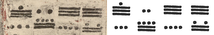 Lo studioso francese scrisse che rappresentavano dei numeri, e notando che i pallini non erano mai più di quattro, suggerì che questi valessero 1 e che le linee valessero 5.