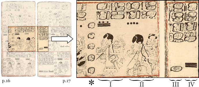 BLOCCO I - A sinistra di Muluc c'è un pallino, che indica il numero 1: la data completa è dunque 1 Muluc. La divinità ritratta nel primo blocco è Ix Chel, che per i Maya era associata alla nascita e alla guarigione; il giorno 1 Muluc era dunque propizio per queste due attività. I quattro simboli in testa al blocco costituivano una previsione relativa allo stesso giorno, che scritta in caratteri latini recita "Chak u kuch Chel ahawlel" ovvero "Chak [dio della pioggia] è il carico di Chel e si impone". I sacerdoti erano incaricati di interpretare questi oracoli, conoscendo le caratteristiche delle varie divinità e il significato di ogni loro accostamento, e in questo caso l'immagine di vittoria finale ("si impone") era considerata positiva, dunque il giorno 1 Muluc era da ritenersi fortunato.