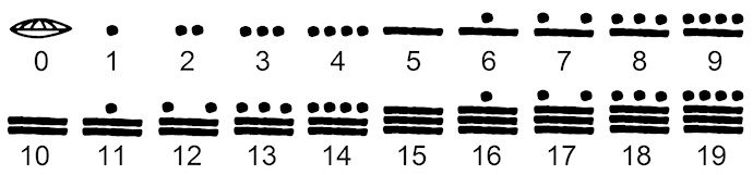Pochi anni dopo si scoprì che i Maya erano in grado di usare i punti e le linee per esprimere numeri anche molto grandi, disponendoli su più livelli. I numeri da 1 a 19 erano di semplice scrittura, mentre il 20 introduceva una novità sorprendente: il numero zero, rappresentato da una conchiglia.