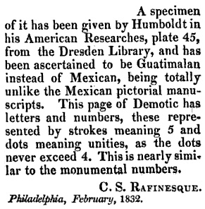 Il primo a decifrare una parte dei misteriosi geroglifici impressi sul codice tedesco fu un bizzarro e geniale studioso autodidatta di origini francesi, tale Constantine Samuel Rafinesque (1783-1840). Oltre che di botanica, archeologia, zoologia e meteorologia, Rafinesque si occupava anche di linguistica, e in un articolo pubblicato nel febbraio 1832 su una rivista da lui curata(1) rivelò di aver imparato a contare come la sconosciuta civiltà che aveva realizzato il codice di Dresda. Non sapeva ancora che si trattasse dei Maya, ma la sua intuizione si rivelò preziosissima nei decenni a venire.