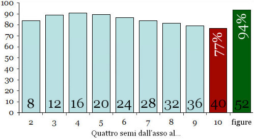 • il mazzo di 40 carte è il peggiore che si possa usare: utilizzando i quattro semi delle carte fino al 10 (quindi escludendo le figure), le probabilità di successo sono del 77% circa (colonna rossa); utilizzando invece tutte le 52 carte (e facendo valere 1 le figure) le probabilità sono del 94% circa (colonna verde). In figura sono illustrate le probabilità al variare del numero di carte utilizzate. Come si spiega il salto tra la penultima e l’ultima colonna?