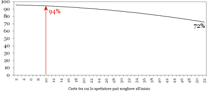 • lo spettatore può scegliere di partire da una delle prime 10 carte. Maggiore è l’ampiezza di scelta che gli viene data, minori sono le probabilità che l’effetto si chiuda con successo. Ovviamente, se lo spettatore è costretto a partire dalla prima carta, il gioco funziona il 100% delle volte. E’ necessario trovare un giusto equilibrio che faccia percepire allo spettatore una piena libertà ma che contemporaneamente non estenda a tutto il mazzo la possibilità di iniziare la conta. Il valore 10, scelto all’inizio, è del tutto arbitrario e garantisce la già citata probabilità del 94%. Se lo spettatore potesse scegliere di partire da una qualsiasi delle 52 carte, la probabilità sarebbe del 72% circa. In realtà si tratta di un caso limite, impossibile da presentare: c’è, infatti, il rischio che la carta da cui desidera partire lo spettatore sia successiva alla carta prevista, il che abbassa ulteriormente la percentuale stimata. Il 72% non tiene, infatti, conto di questa eventualità. Può essere utile rilevare che il gioco riesce ancora nel 90% dei casi se allo spettatore è concesso di scegliere una delle prime 20 carte, scende invece all’80% se la scelta è allargata alle prime 43 carte. Ecco come varia la probabilità all’aumentare dell’ampiezza della scelta iniziale: