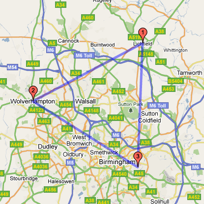 L'accuratezza del triangolo rosso si può facilmente verificare con il mio software Sacred Geometries powered by Google Maps: fissando le coordiate GPS dei punti A e B tratte dalla cartina su riprodotta si ottiene un perfetto triangolo equilatero (Triangle B) definito dalle città di Wolverhampton, Lichfield e Birmingham.
