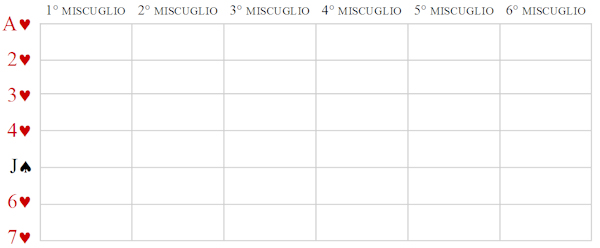 Il significato delle varie espressioni è semplice da capire: la prima casella in alto punta su A6 perché dopo il primo miscuglio la sesta carta finirà in cima al mazzetto; la seconda casella punta su A4 perché dopo il miscuglio, è la quarta carta a finire in seconda posizione, e così via...