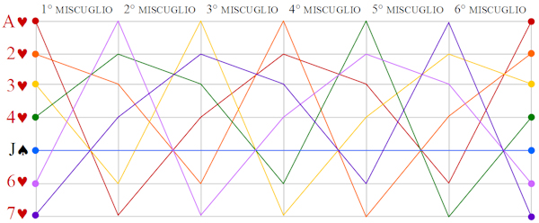 L’altro aspetto interessante da notare è che il tragitto compiuto dalle sei carte che si spostano è identico: se una carta si trova in prima posizione, dopo il prossimo miscuglio finirà in ultima posizione, indipendentemente da quanti miscugli siano stati eseguiti fino a quel momento; i vari persorsi sono semplicemente sfasati l’uno rispetto all’altro.