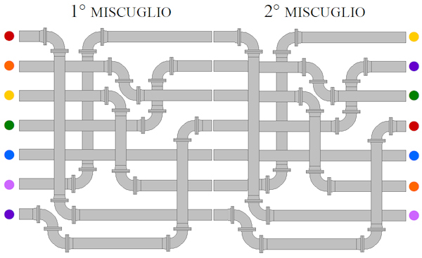Studiare l’effetto di due miscugli significa applicare due volte una funzione al vettore di partenza; per visualizzare più facilmente l’azione dei due miscugli sulle carte è sufficiente duplicare la struttura dei tubi.