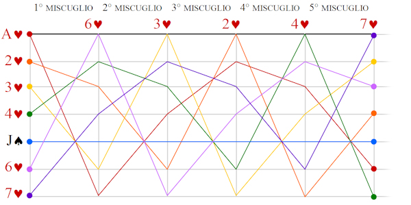 La carta che all’inizio si trova in sesta posizione (il sei di cuori) finisce in cima dopo il primo miscuglio; la carta in seconda posizione (il due di cuori) raggiunge la cima dopo il terzo miscuglio, e così via...