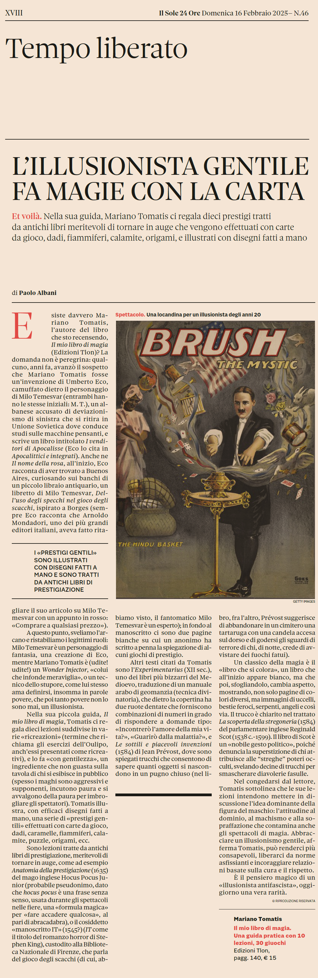 Nel congedarsi dal lettore, Tomatis sottolinea che le sue lezioni intendono mettere in discussione l’idea dominante della figura del maschio: l’attitudine al dominio, al machismo e alla sopraffazione che contamina anche gli spettacoli di magia. Abbracciare un illusionismo gentile, afferma Tomatis, può renderci più consapevoli, liberarci da norme asfissianti e incoraggiare relazioni basate sulla cura e il rispetto. È il pensiero magico di un illusionista antifascista, oggigiorno una vera rarità. (1)