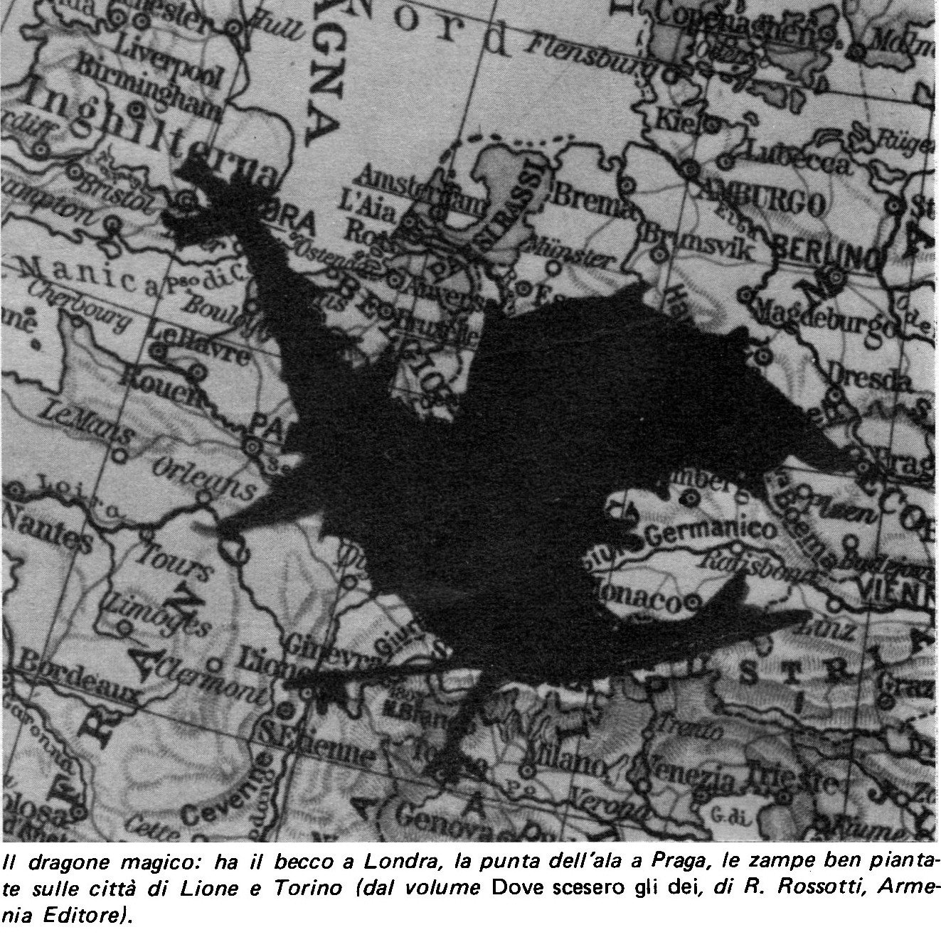 Dunque, nel cuore dell’Europa, tenuta insieme da un dragone, c’è una ragnatela magica che collega quattro città. Il fatto è singolare e non stupisce che di tanto in tanto faccia scorrere un rivoletto d’inchiostro; spesso si sentono anche fastidiose imprecisioni. Cosi è possibile che in una miscellanea assurda, si affianchino alle città del continente metropoli d’oltreoceano che non c’entrano affatto. Con divertita sorpresa abbiamo appreso da L’Espresso, nella rubrica “Il lato debole” (a cura di Camilla [Cederna]), che in Torino prospera la magia nera — e questo lo sapevamo da un pezzo — e che “Torino è uno dei vertici del triangolo di magia nera esistente al mondo (gli altri sono Londra e Chicago)...”