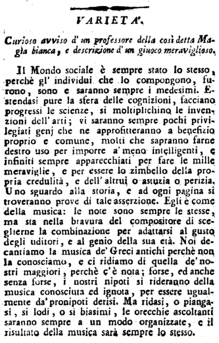 Il Mondo sociale è sempre stato lo stesso, perché gl’individui che lo compongono, furono, sono e saranno sempre i medesimi. Estendasi pure la sfera delle cognizioni, facciano progressi le scienze, si moltiplichino le invenzioni dell’arti; vi saranno sempre pochi privilegiati geni che ne approfitteranno a benefizio proprio e comune, molti che sapranno farne destro uso per imporre a meno intelligenti, e infiniti sempre apparecchiati per fare le mille meraviglie, e per essere lo zimbello della propria credulità, e dell’altrui o astuzia o perizia.